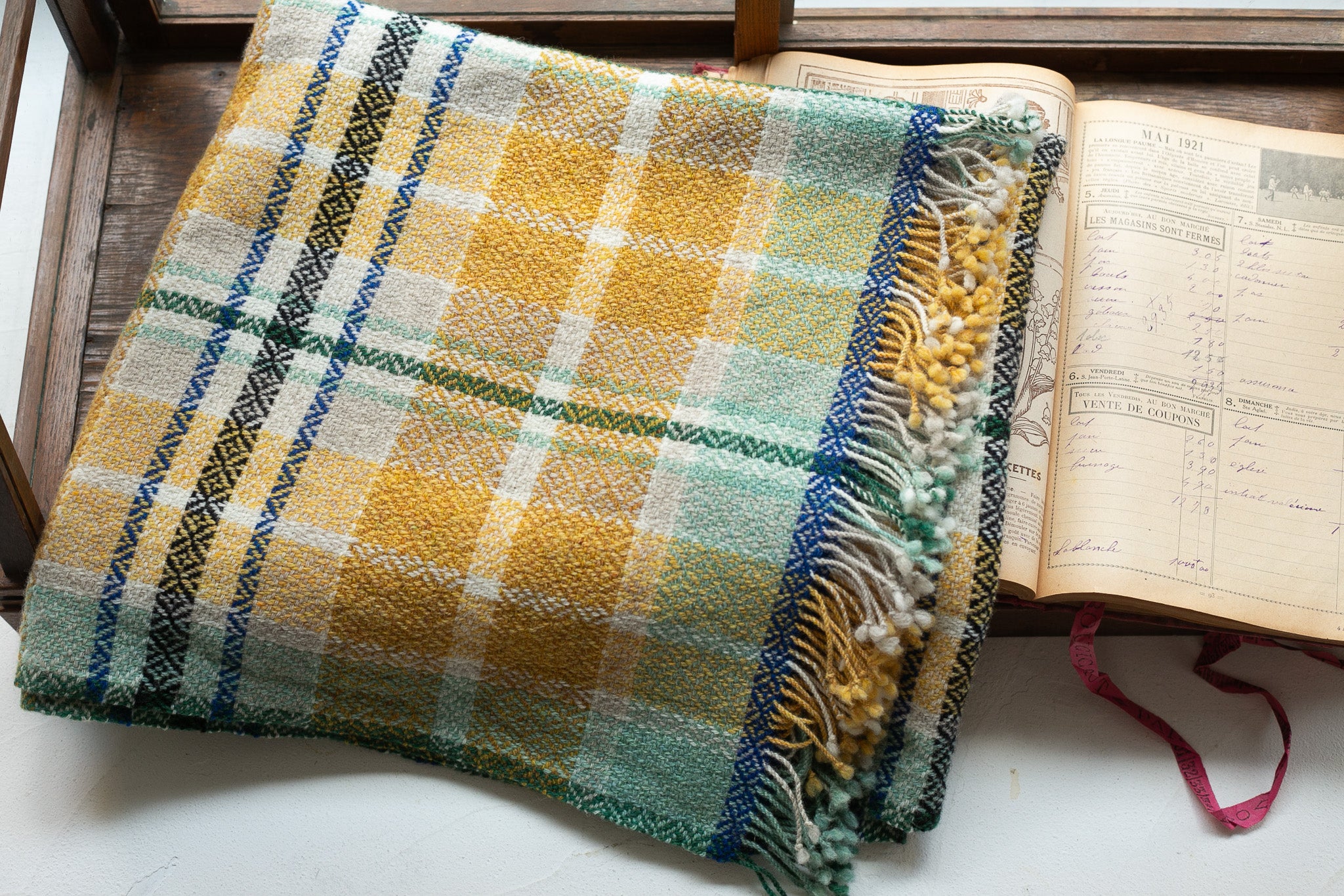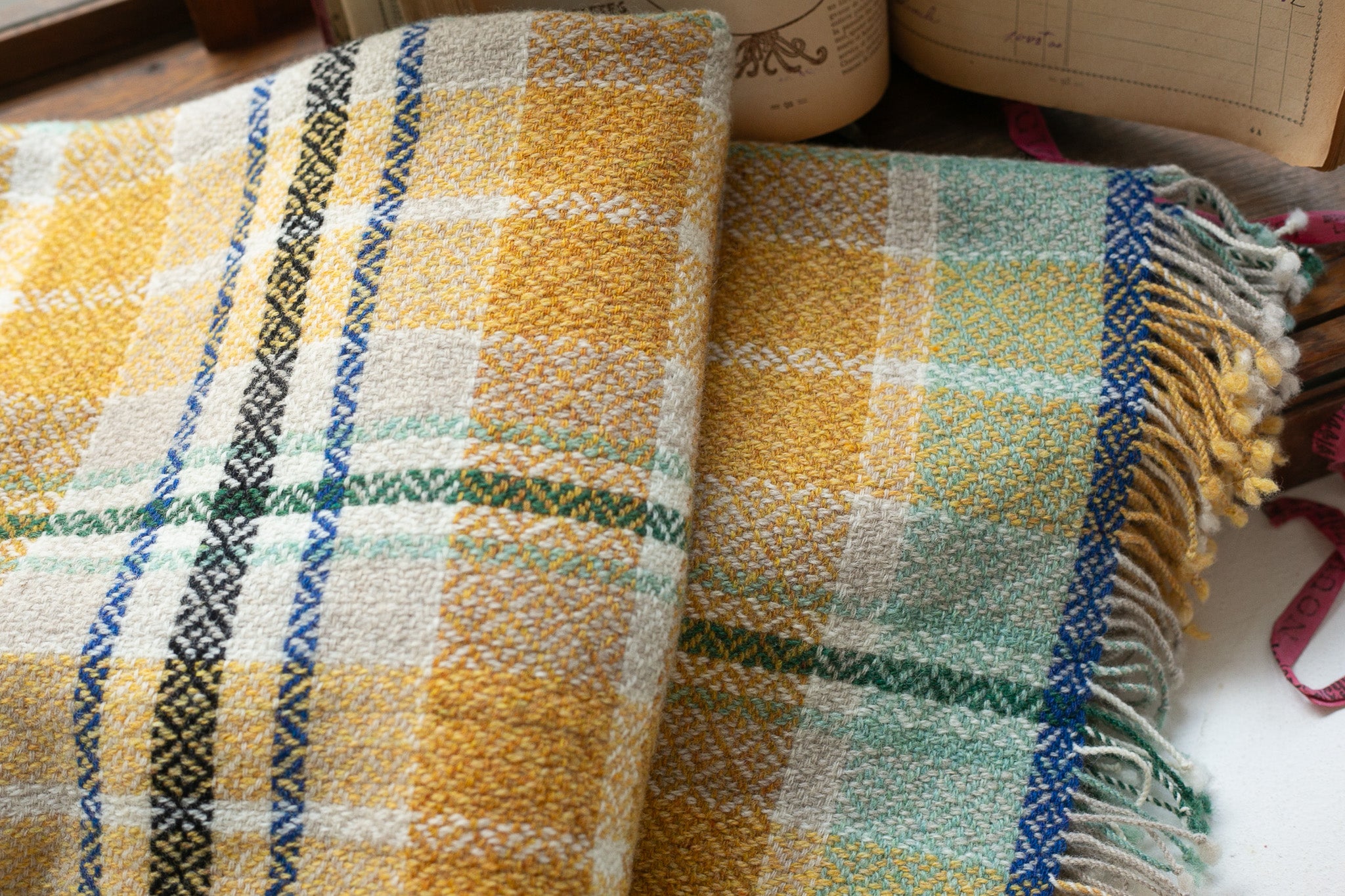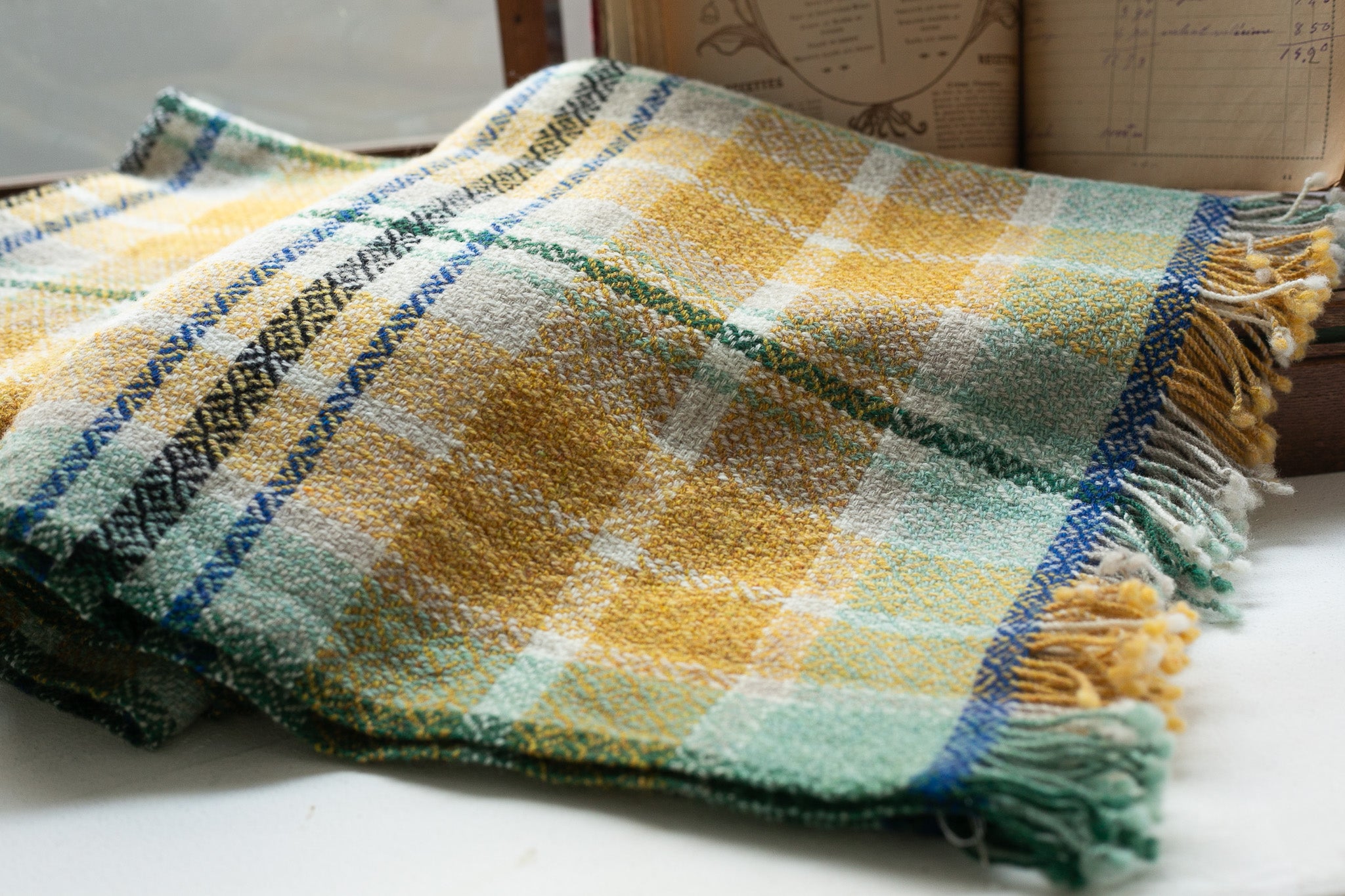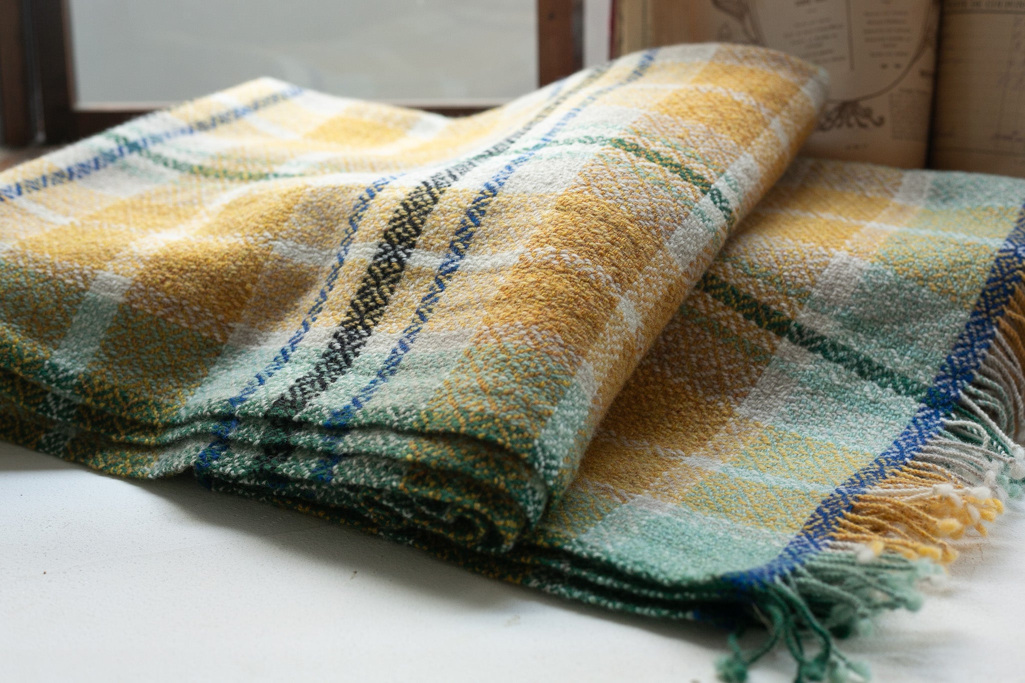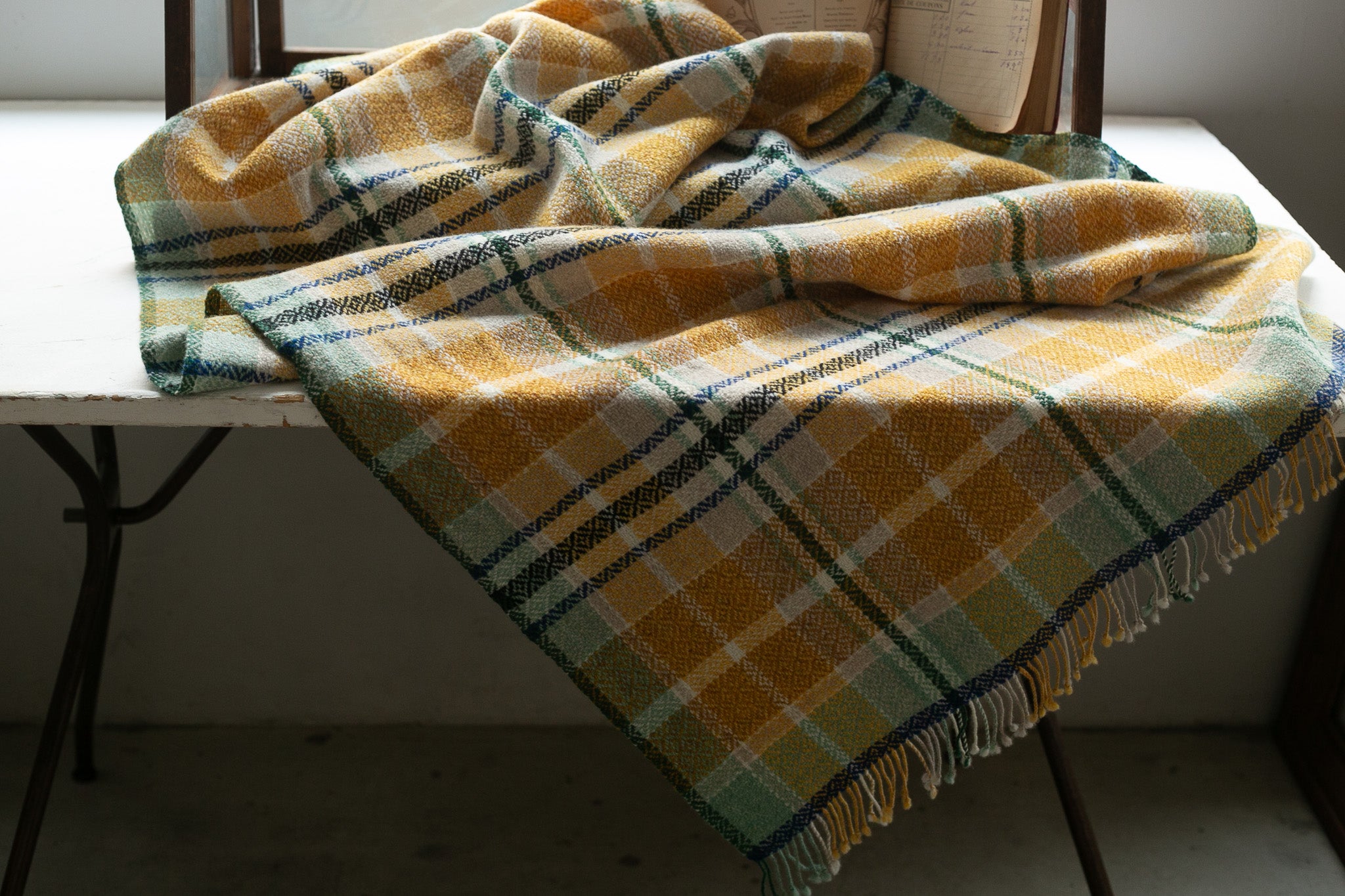 爽やかなミントグリーンと深みのあるブルーがアクセントになったひざ掛けです。